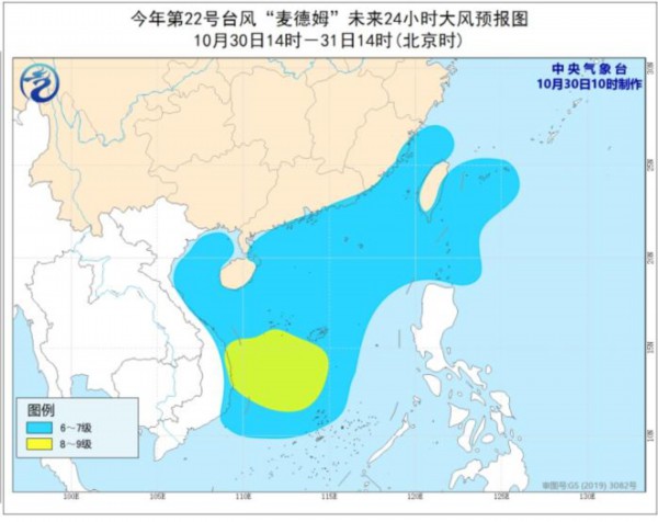 大风预报:受冷空气和“麦德姆”的共同影响,30日14时至31日14时,福建沿海、台湾沿海、广东沿海、海南岛沿海、琼州海峡、台湾海峡、巴士海峡、北部湾、南海大部海域、西沙群岛、中沙群岛和南沙群岛将有6-7级大风,其中南海中西部和西南部的部分海域有8-9级大风,阵风10级。