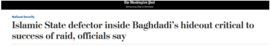 《华盛顿邮报》29日报道提到,根据了解美军此次行动的美国及中东官员的说法,在26日的突袭行动中,此人对巴格达迪行踪以及住所房间布局的详细了解被证明是至关重要的。当美军突袭巴格达迪位于叙利亚伊德利卜省的藏身地时,这名线人在场,两天后,他与家人从该地区撤离。有关官员透露说,该男子的国籍尚未被公布,美国悬赏2500万美元捉拿巴格达迪的赏金里,预计他将得到部分或全部赏金。