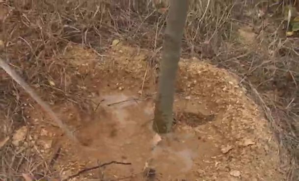25号下午,在滁州市南谯区施集镇一处山头上,村民程宏赋利用山洼当中仅存的一点水,给自己的苗木浇水。希望苗木能坚持时间长一点,等待降雨。目前,已经有一些苗木枯死。