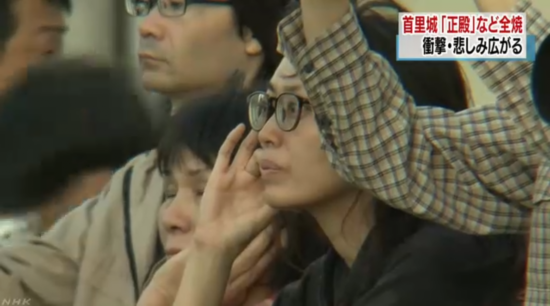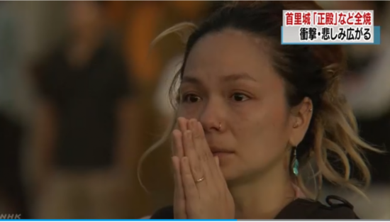 一名82岁的女性向着首里城的方向,双手掩面呆站在原地。这位生在首里长在首里的老太太,见证了首里城在战争中被摧毁,然后从又从一片荒原开始重建,现在却又看到重建的成果化为乌有,她哽咽着说道,“冲绳的象征,我们的宝物。这不是经济损失的问题,冲绳人失去的是心灵支柱。”