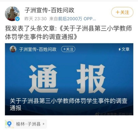 新京报讯 10月30日晚,陕西榆林子洲县针对近日关于“榆林7岁女孩被老师体罚右眼肿胀左耳有裂伤”一事做出回应,称情况基本属实。涉事教师已被辞退。