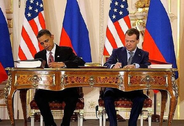资料图:《新削减战略武器条约》于2010年4月8日由美国总统奥巴马和俄国总统梅德韦杰夫在捷克首都布拉格签署(百度百科)