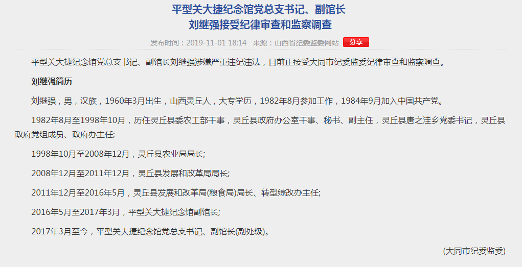 荔枝新闻讯 11月1日,山西省纪委监委网站援引大同市纪委监委消息称:平型关大捷纪念馆党总支书记、副馆长刘继强涉嫌严重违纪违法,目前正接受大同市纪委监委纪律审查和监察调查。