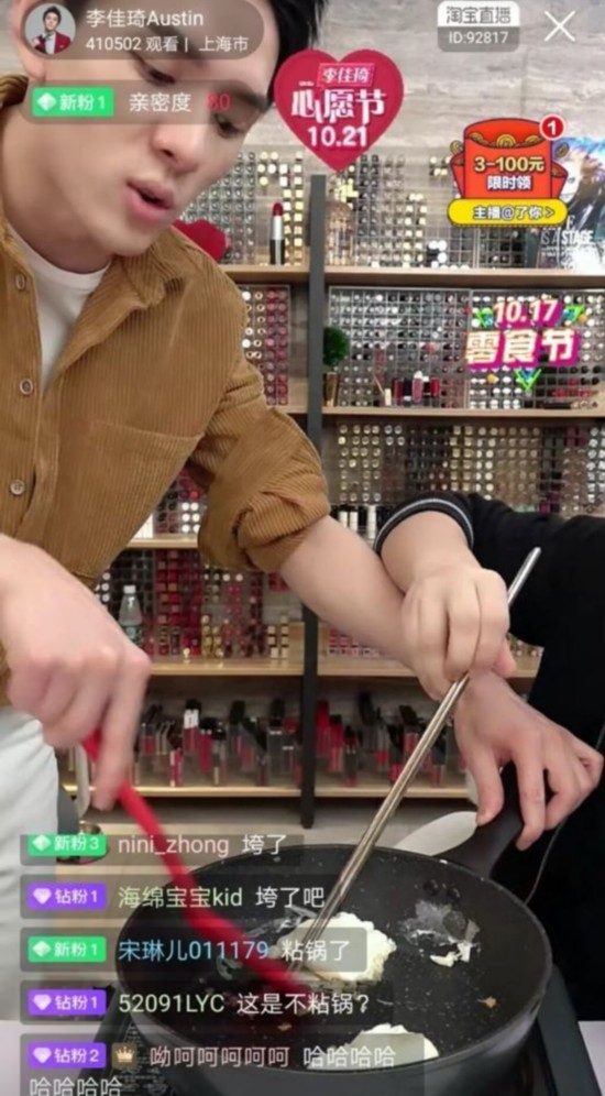 但近日,李佳琦在直播中演示不粘锅煎鸡蛋,鸡蛋粘在锅上难以铲动,李佳琦却坚称“它是不会粘的”。