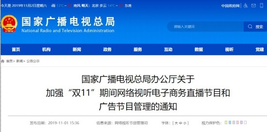 11月1日,国家广播电视总局发布《国家广播电视总局办公厅关于加强“双11”期间网络视听电子商务直播节目和广告节目管理的通知》(下简称《通知》)。