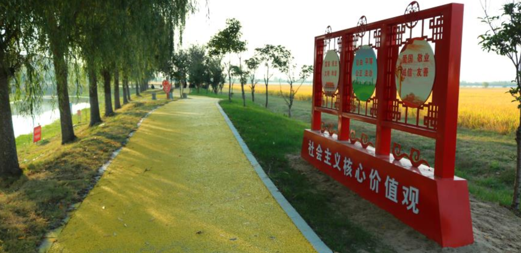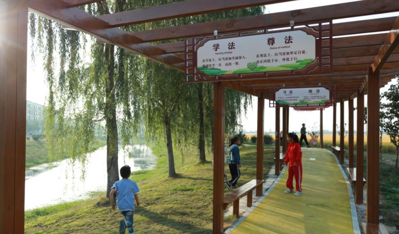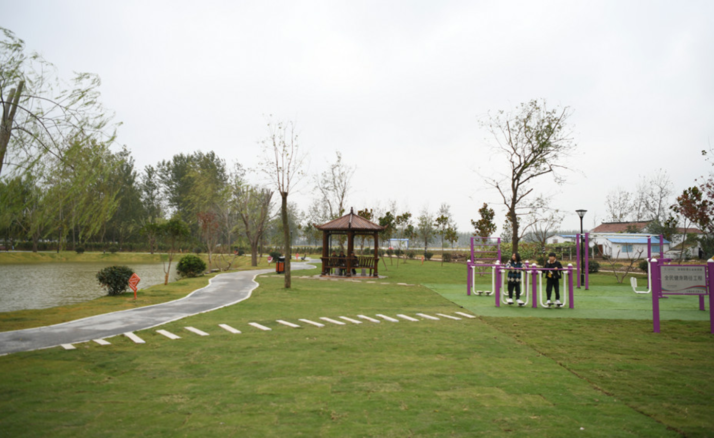 村里的大片稻子熟了,田埂边的小公园也竣工了。