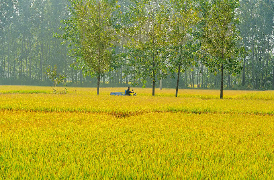 成熟的水稻将田野染成金黄,仿佛为大地披上金装,呈现出一幅美丽秋日田园风景。刘继坤 摄