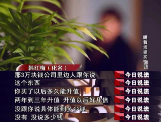 韩红梅在公司对面的商场里做保洁。从来没有接触过收藏品行业的她,也被业务员拉过去介绍投资。在得到“买了后会升值”的保证下,韩红梅花13万元买了几件收藏品。