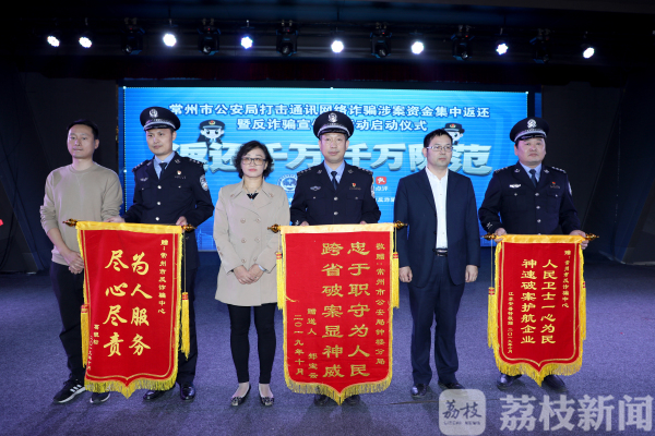 当前,通讯网络诈骗案件多发,严重侵害人民群众的财产安全,影响社会稳定和群众安全感、获得感、满意感。为有效遏制通讯网络诈骗犯罪高发态势,维护人民群众切身利益,提高广大群众识骗、拒骗、防骗的意识和能力,展示常州公安机关打击通讯网络诈骗犯罪的成效和追赃挽损的决心,11月2日上午,常州市公安局举行“返还千万,千万防范”打击通讯网络诈骗涉案资金集中返还暨反诈宣传月活动启动仪式。