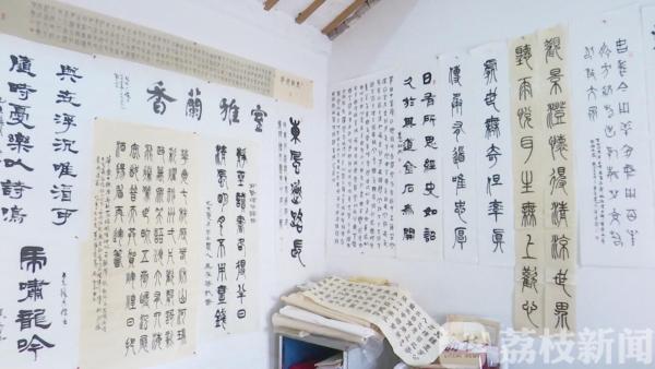 一张简陋的自制案桌、一个旧书柜,一张板凳,这就是吴老的书房了,书房虽简单,但吴老的书法却不简单,满墙的作品让书房充满了书香气息。吴老告诉记者,自己年轻的时候忙于生计,经济条件也不太好,所以那时候练书法的机会很少,多半是买些字帖回来看看,用草纸代替宣纸临摹练习。