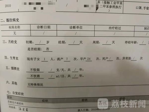 李女士是今年7月份由单位组织,到南京市江北人民医院体检的,9月中旬拿到了体检报告,在查看体检情况时,有一项体检结果让李女士吓了一跳:流产7次,早产24次。