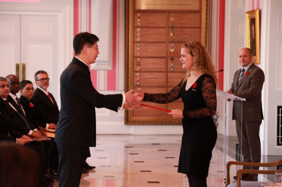 当地时间11月1日,我新任驻加拿大大使丛培武在位于渥太华的加拿大总督府向朱莉 帕耶特总督递交国书。