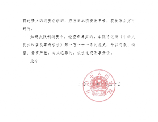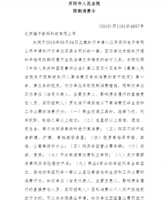 限制消费令显示,丹阳市人民法院于2019年09月04日立案执行申请人江苏辰阳电子有限公司申请执行买卖合同纠纷一案,因北京锤子数码科技有限公司未按执行通知书指定的期间履行生效法律文书确定的给付义务,法院对北京锤子数码科技有限公司采取限制消费措施,限制北京锤子数码科技有限公司及单位(法定代表人、主要负责人、影响债务履行的直接责任人员、实际控制人)罗永浩不得实施以下高消费及非生活和工作必需的消费行为: