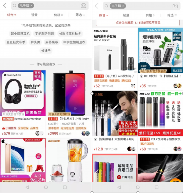 1日晚(左图),拼多多屏蔽了“电子烟”的搜索结果,3日(右图)屏蔽已解除