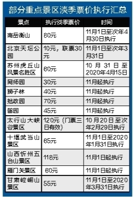 每年10月底、11月初,是旅游行内公认的淡旺季门票转换期,多数执行淡旺季差别价的景区在此时转为淡季收费标准,全国各地陆续有景区进入“省钱”名单:北京故宫旺季票价60元、淡季票价40元,颐和园旺季票价30元、淡季票价20元;新疆天山天池风景名胜区旺季票价95元、淡季票价45元,喀纳斯景区旺季票价160元,淡季票价80元;山西云冈石窟旺季票价120元、淡季100元……