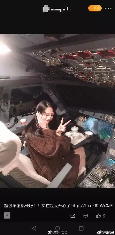 11月3日晚,有航空领域博主发文称,某航空公司航班允许无关旅客进入驾驶室就坐。图片中,一年轻女性在驾驶舱捂脸比V,面前还放有开口茶具,配文“谢谢机长”。