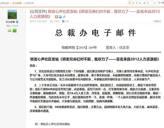 荔枝新闻讯 近日,华为心声社区传出的HR胡玲实名发帖《研发兄弟们对不起,我尽力了——实名来自2012人力资源部》一事,任正非今天转帖发表评论表示:实名投诉是公司管理民主的一个好现象,要支持保护当事人,同时当事人要坚持实事求是。