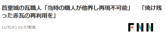 据富士电视台新闻网(FNN)5日报道,冲绳县瓦匠工会于5日告诉记者,要再现首里城正殿中使用的瓦片是一件“不可能的事”。该工会表示,正殿使用的“赤瓦”共计5万5千块,全部以很难再采集到的稀有土质为原料,现今再难获得。