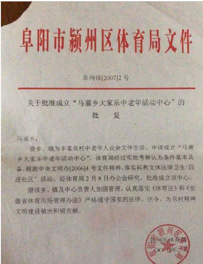 在一份由阜阳市颍州区体育局(现颍州区文化旅游体育局)出具的相关文件显示,2007年经该局批准,马寨乡成立“大家乐中老年活动中心”。而这间“中老年活动中心”,正是后来导致申友证被羁押的“棋牌室”。