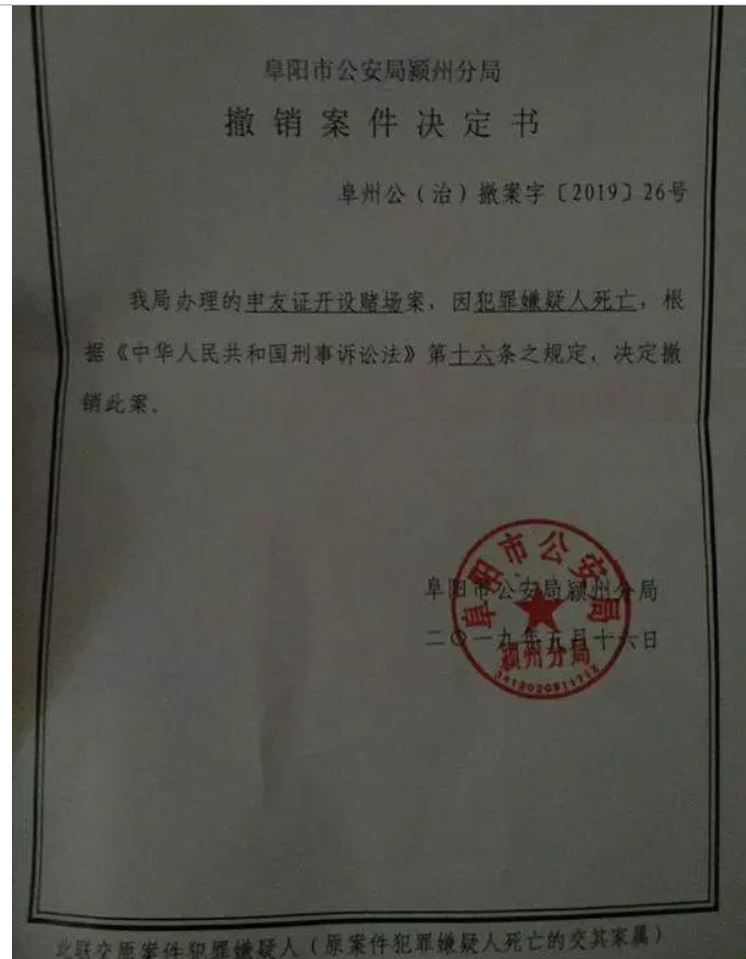 在一份由阜阳市公安局颍州分局出具的撤案决定书中,记者看到,该局办理的申友证开设赌场案,因犯罪嫌疑人死亡,根据《刑事诉讼法》第16条规定。于5月16日,阜阳市公安局颍州分局决定撤案。