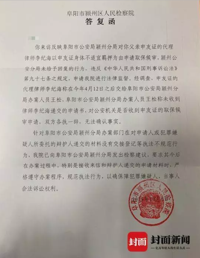 一份由颍州区检察院出具答复函显示,颍州区检察院调查后认为,双方各执一词,无法确认事实,但针对阜阳市公安局颍州分局办案部门,在对申请人或犯罪嫌疑人所委托的辩护人递交材料,没有交接登记等执法不规范行为,检察院已向阜阳市公安局颍州分局发出检察建议,要求其严格遵守办案程序,规范执行行为,以保障犯罪嫌疑人、当事人的合法诉讼权利。