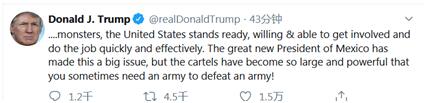 特朗普接着写道:“如果墨西哥需要或者请求(我们)帮助清理这些怪物们,美国已做好准备,愿意并且有能力参与其中,迅速有效地完成这项工作。伟大的新墨西哥总统已把这当成一个大问题,但卡特尔组织已经变得如此庞大和强大,有时,你需要用一支军队来击败一支军队!”