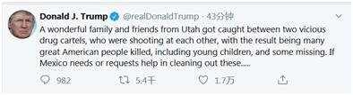 此事也惊动了美国总统特朗普。当地时间5日,特朗普就此事连发三推。“来自犹他州的一个很棒的家庭和朋友被两个凶残的贩毒集团抓住了,他们两方互相开枪,结果导致许多伟大的美国人被杀害,包括年轻的孩子,还有一些人失踪了。”