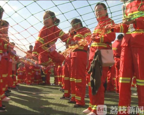 身着消防演习服装的幼儿,在消防专业人员的指导下,正努力地在逃生网上攀爬向前,别看他们年龄小,有的还是刚入园的新生,但接到火情的命令,他们一个个争分夺秒,以最快的行动完成了10米长的逃生之路。