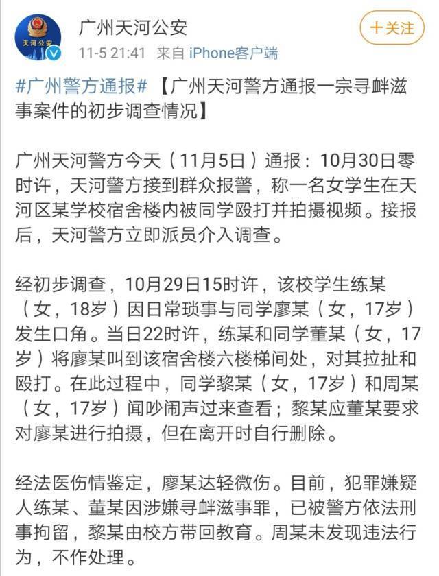 11月5日晚,广州天河警方通报一宗寻衅滋事案件的初步调查情况,10月30日零时许,天河警方接到群众报警,称一名女学生在天河区某学校宿舍楼内被同学殴打并拍摄视频。接报后,天河警方立即派员介入调查。