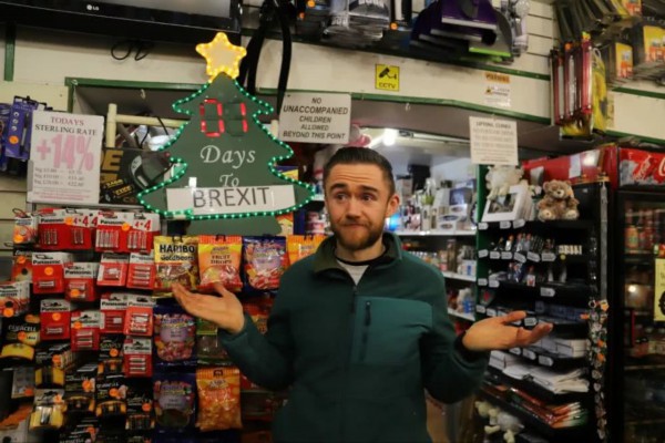 正值圣诞节采购季,摩根位于边境小镇克朗斯的商店里顾客很多。他在店里放置了一个“脱欧”倒计时指示牌。可“脱欧”一拖再拖,指示牌也一直显示距离“脱欧”仅剩1天。