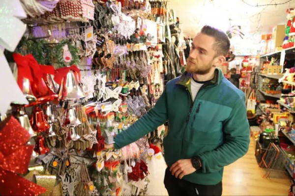 10月31日,在爱尔兰北部边境小镇克朗斯,夏兰·摩根在他经营的杂货店内整理刚从中国订购来的圣诞节装饰物。新华社发