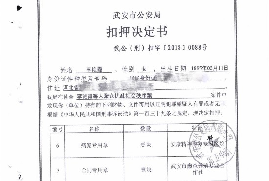 由武安市公安局于2018年5月6日出具的《扣押决定书》显示,警方以“我局在侦查李艳霞等人聚众扰乱社会秩序案案件中,发现你(单位)持有下列财务、文件,可用以证明犯罪嫌疑人有罪或者无罪”为由,将包括腰带、茶叶、酒、保健品在内财物“予以扣押”。