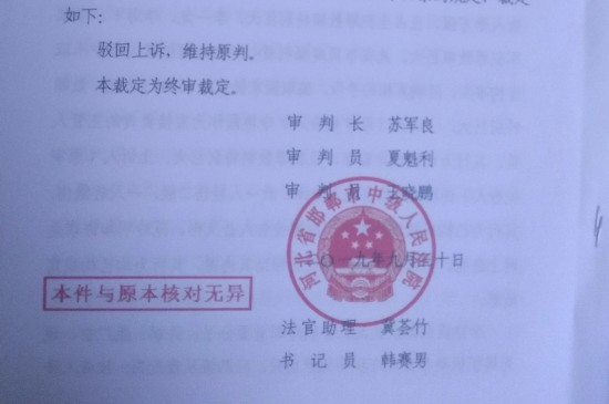 邯郸市中级法院二审刑事裁定书,驳回李利娟(现用名李艳霞)上诉,维持原判。 受访者供图