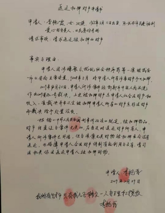 李利娟手写的返还扣押财产申请书。 受访者供图