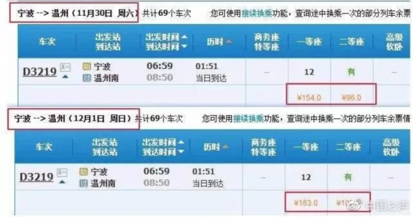 然而,票价也并不是都处于降价趋势,对于部分列车段而言,票价也出现了上升的情况。以宁波开往温州的G2343次列车为例,11月30日,该车的商务座288元,一等座154元,二等座96元;而12月1日,该车的票价商务座、一等座、二等座分别上涨17元、9元和6元,票价出现了小幅上涨。