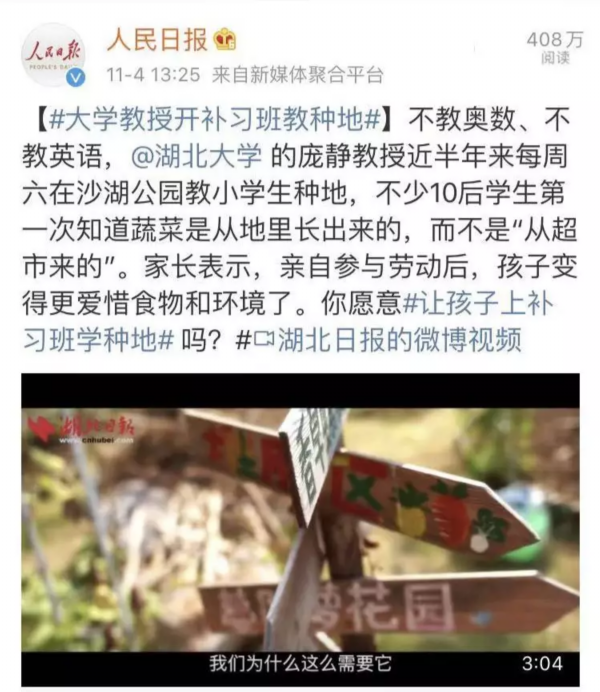 据人民日报消息,近半年来,湖北大学资源环境学院副教授庞静每周六在沙湖公园教小学生种地,不少10后学生第一次知道蔬菜是从地里长出来的,而不是“从超市来的”。
