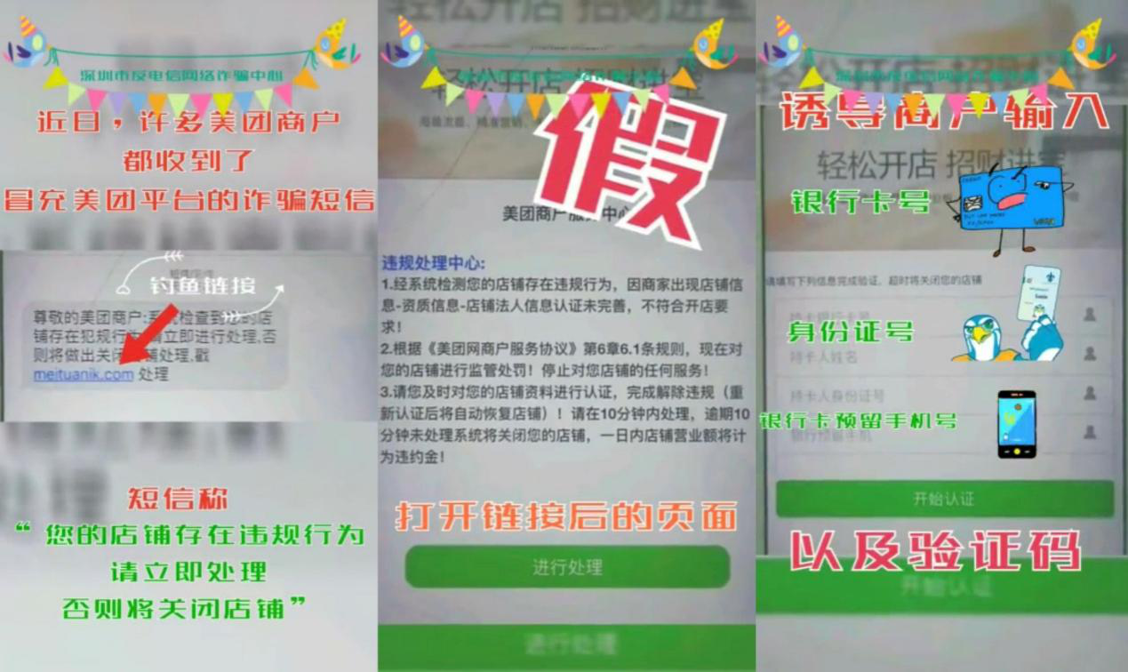 近日,警方提示有犯罪分子冒充美团官方平台发送要求商户认证的短信,内含钓鱼网站链接,诱导商户输入身份证、银行卡、手机号、验证码等信息从而对商户银行卡进行盗刷,造成经济损失。发现相关情况后,美团第一时间向商家发出防骗预警,并与当地警方取得联系,展开联合打击行动。