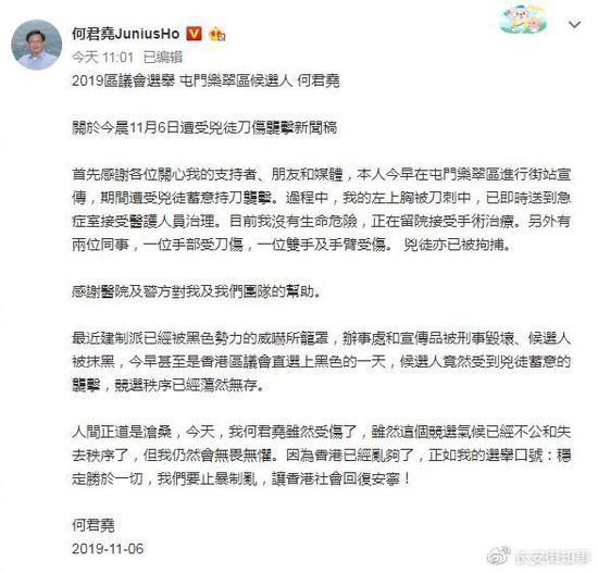 上午11时01分,何君尧通过微博@何君尧JuniusHo 发声,表示目前他没有生命危险,正在留院接受手术治疗,另有两位同事也在遇袭事件中受伤。
