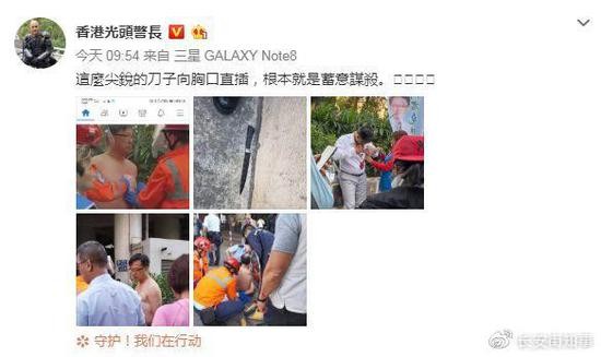 长安街知事注意到,何君尧遇袭的消息传出后,香港光头警长刘sir也第一时间在微博上表达关切,并对如此恶劣的暴力行径表示愤慨。他说:“这么尖锐的刀子向胸口直插,根本就是蓄意谋杀。”