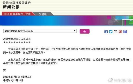 对于何君尧遇袭一事,香港特区政府中午发表声明,强烈谴责此次袭击行为,称“警方已拘捕一名涉案男子,会深入调查案件”。