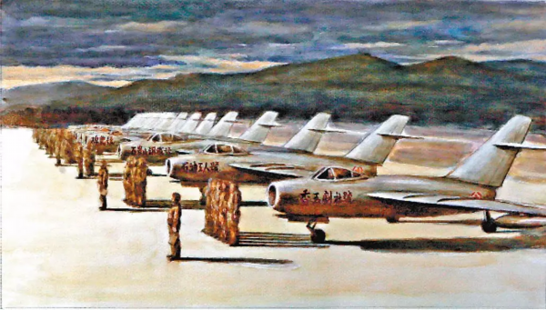 这张“同框照”是空军画家陈玉山创作的油画作品,所画的是“香玉剧社号”“石油工人号”“石景山钢铁厂号”“棉农号”战斗机的大聚会,昭示了一个朴素的道理:人民空军人民建,人民空军爱人民。
