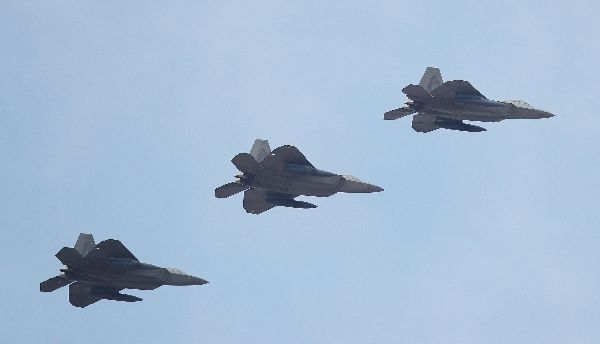 资料图:2017年12月2日,美国6架F-22隐形战机飞抵韩国,将参加4日开始的“警戒王牌”年度大规模大联合空中演习(视觉中国)