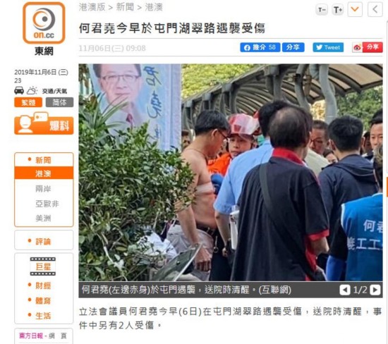 今早(6日)8时许,香港立法会议员何君尧在位于屯门的一家商场外遇袭。警方消息称,何君尧被可疑人员刺伤,随后被救护车送医,事件中有三人受伤。何君尧被送医时人处在清醒状态。
