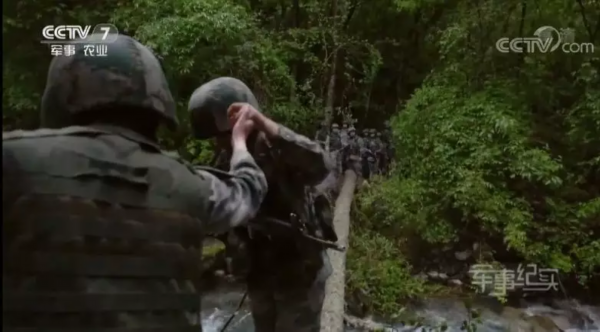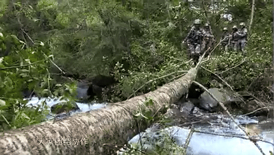 女兵们用树干搭建了一座独木桥