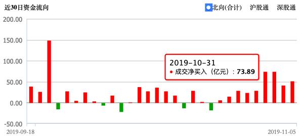 Wind数据显示,北向资金10月31日、11月1日连续净流入73.89亿元、74.49亿元,较此前大幅提升。近期已连续9个交易日净流入。