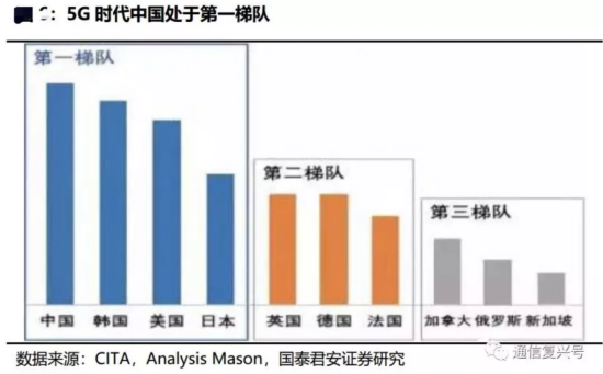 据CITA和AnalysisMason的数据显示,目前5G时代,中国在全球主要国家的5G竞备中处于领先地位,与中国同处第一梯队位置的还有韩国、美国和日本。