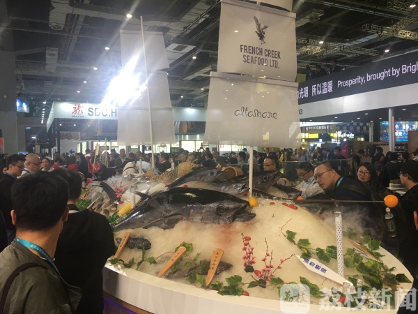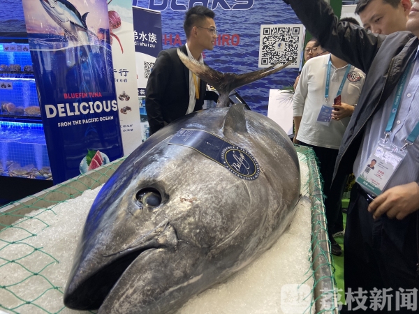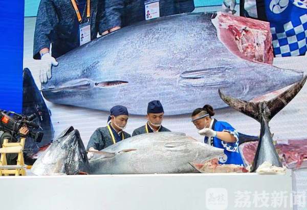 上海水产集团进博会外方代表王晓晨介绍:“这条是我们从地中海捕捞的养殖蓝鳍金枪鱼,运输路径是从巴塞罗那到广州再到上海,实际我们运输时间也就在14小时左右,也就说时间是非常短的,这条鱼是非常新鲜的。它在国内的销售和接受度在国内还不是非常大,我们也是希望通过这次进博会让大家更多认识到金枪鱼这个种类。”