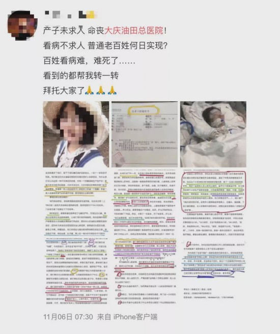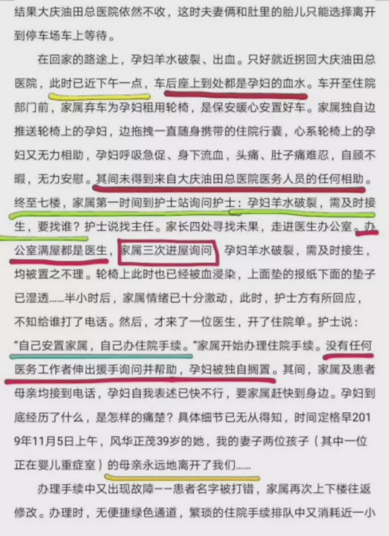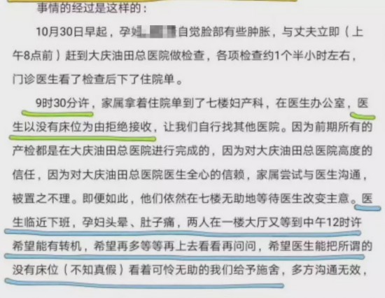 据网帖反映,网友闫某自称是死者刘某某丈夫,10月30日,大庆油田总医院医生检查后给临产的刘某某下了住院单,但是妇产科以没有床位为由拒绝接收,后刘某某出现羊水破裂、出血症状,因未能及时得到医院救助最终于11月5日去世。