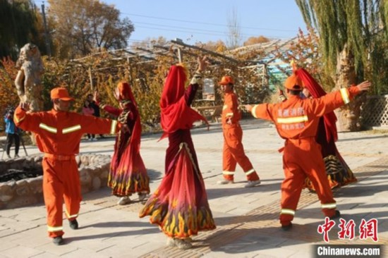 中新网乌鲁木齐11月9日电 防范火灾风险,建设美好家园。”11月8日,在新疆阿克苏地区阿瓦提县刀郎部落,三名身穿消防救援服男子和三名穿着舞蹈服的女子一边翩翩起舞,一边高声齐喊今年“119”消防宣传月活动的主题口号。