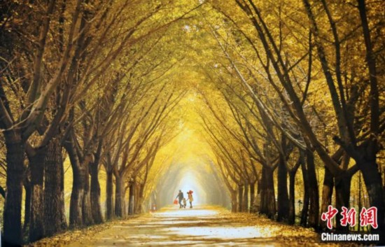 江苏邳州市铁富镇的银杏”时光隧道。图片来源:邳州市委宣传部供图